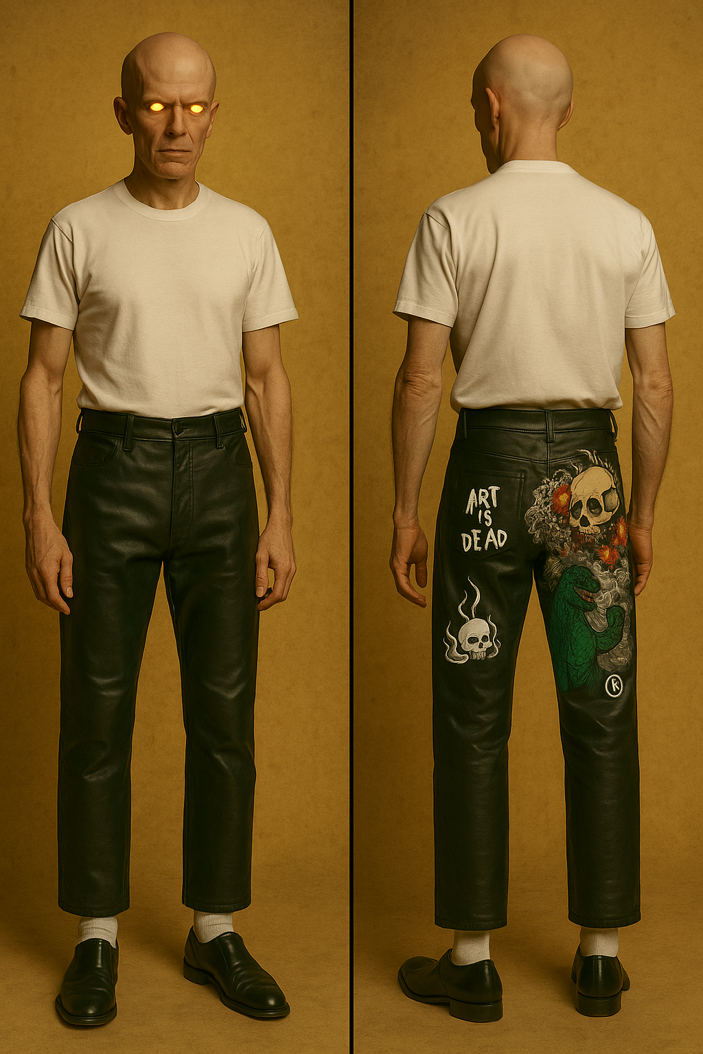 These are a one of on hand painted and cropped leather biker pants, classic Japanese style art work that is synonymous to the brand. this is a bold statement piece that will elevate any wardrobe.